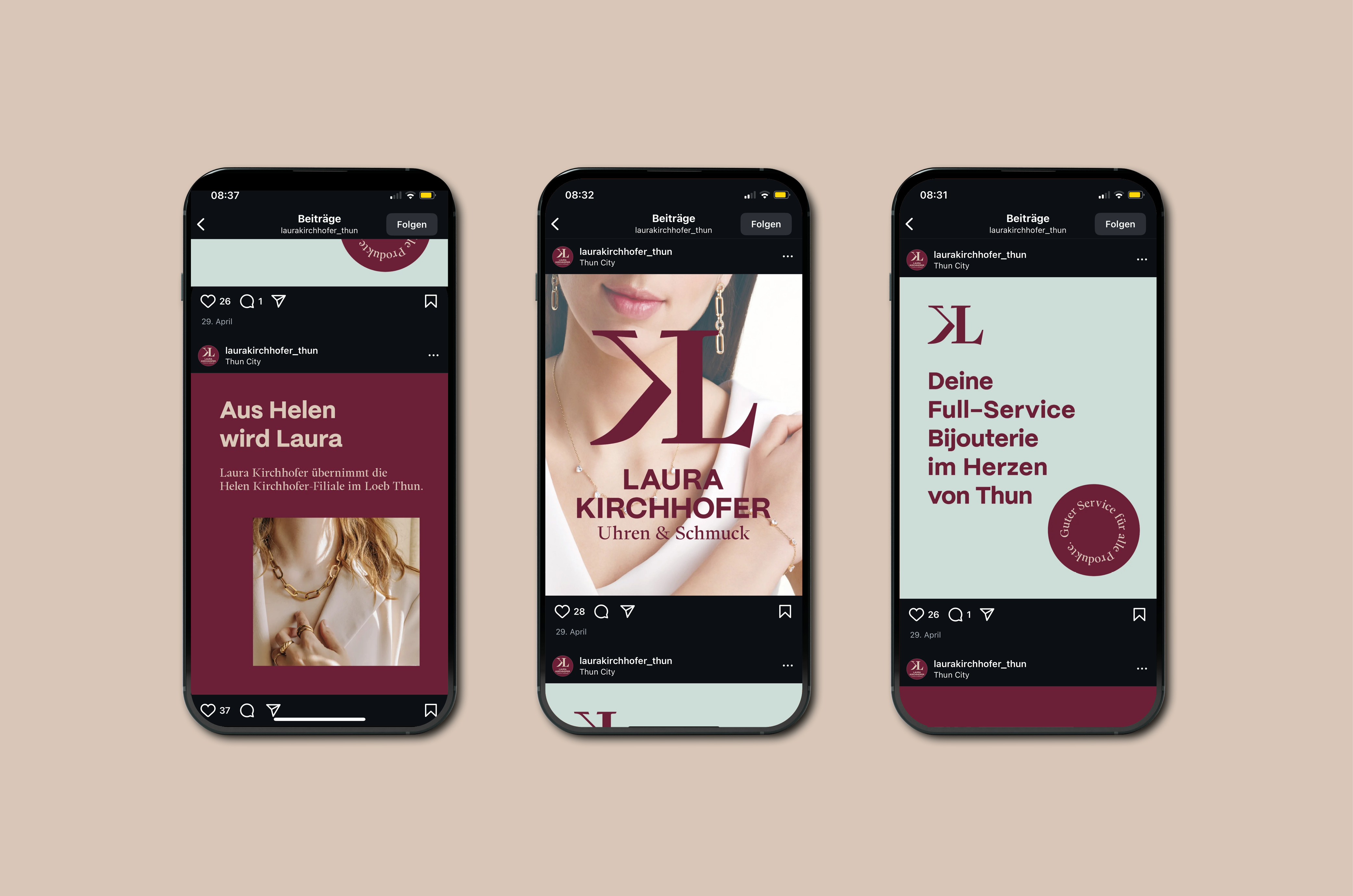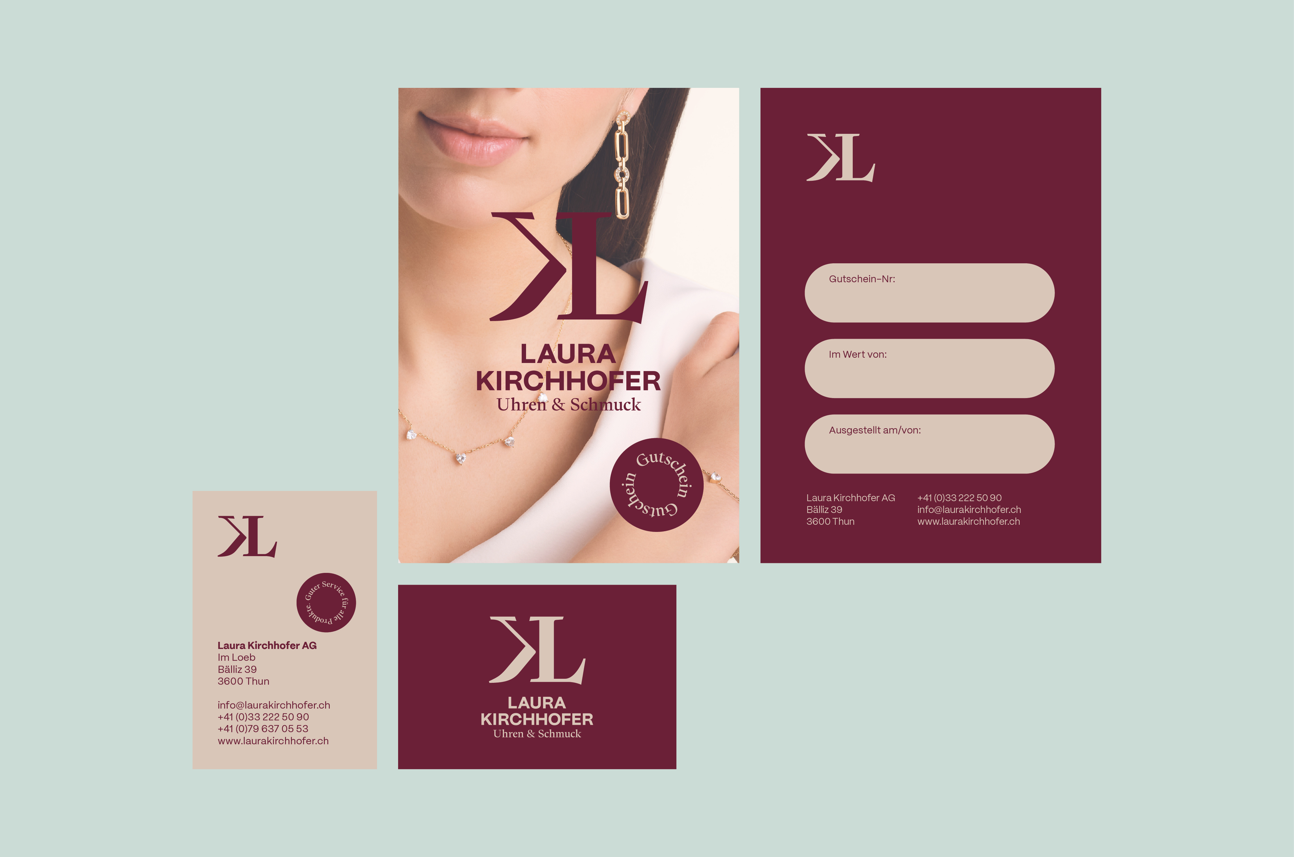 Aus der Bijouterie Helen Kirchhofer AG wurde 2024 die Laura Kirchhofer AG – mit frischem Namen, neuem Auftritt und der gleichen Leidenschaft für Schmuck und Uhren. Mit dem Umbau der Filiale in Thun, einem neuen Branding und einem erweiterten Portfolio führt Laura den Familienbetrieb in eine neue Ära. Wir durften den gesamten Markenauftritt gestalten – vom Logo, über die Farben- und Bildwelt bis hin zum Webdesign und den Texten.